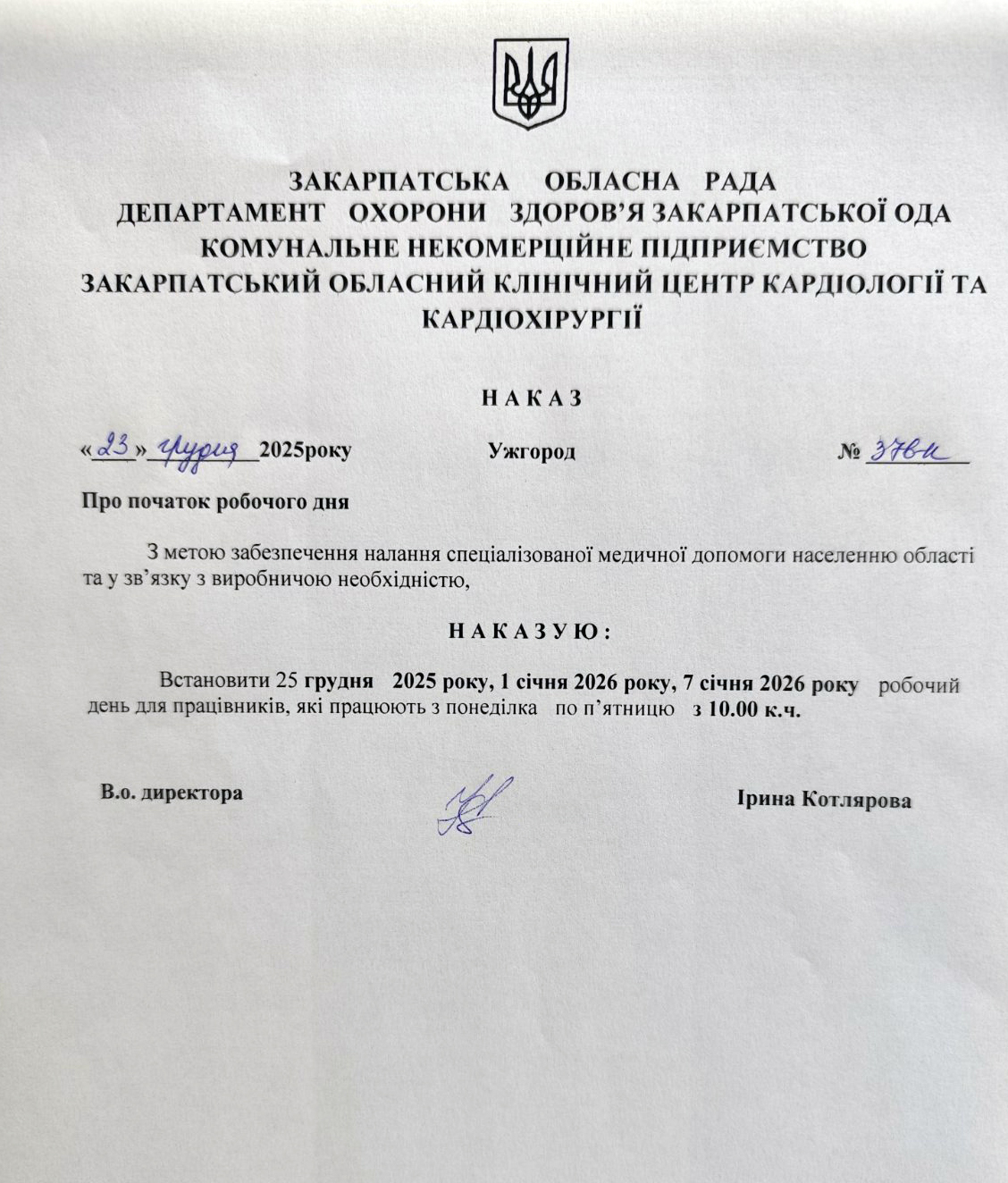 Інформуємо про зміну графіка роботи КНП «Закарпатський обласний клінічний центр кардіології та кардіохірургії» ЗОР у святковий період.