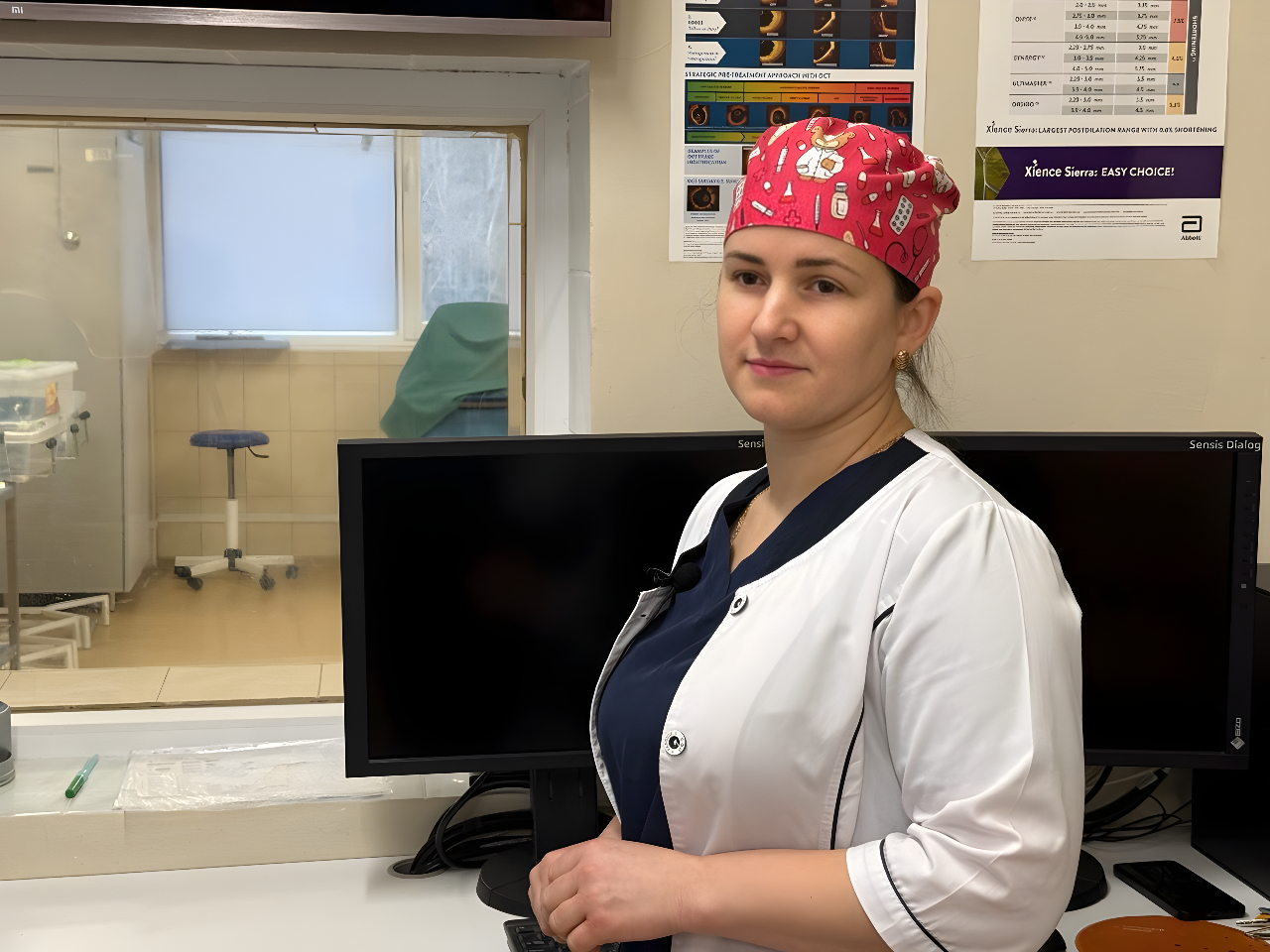 В іншому крилі кардіоцентру нас зустрічає старша медична сестра відділення фізіології і кардіостимуляції Світлана Галега (вище на фото). Перед камерою хвилюється, зізнається це в стократ складніше – давати інтерв’ю, ніж організовувати операцію та годинами безперервно допомагати кардіохірургові. Зізнається, що теж змалечку мріяла стати саме операційною медсестрою. Зараз вона вже виконує й цю роботу. Йшла до неї тривалий час, багато працювала, вчилась, і каже, що коли вперше потрапила у відповідній ролі до операційного залу, зрозуміла – мрії збуваються.