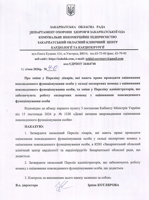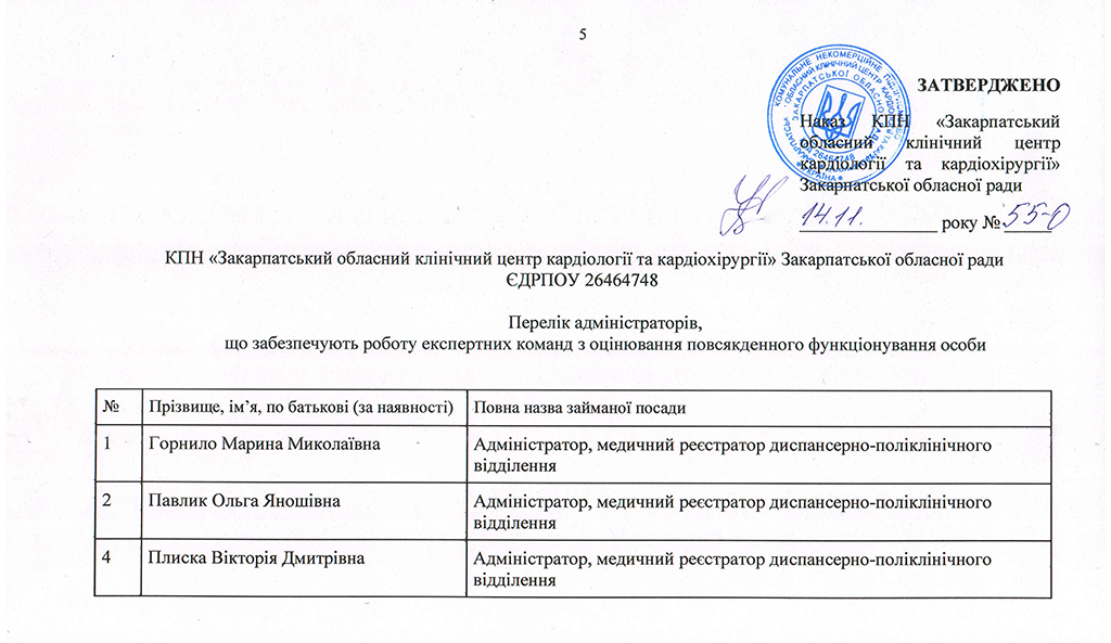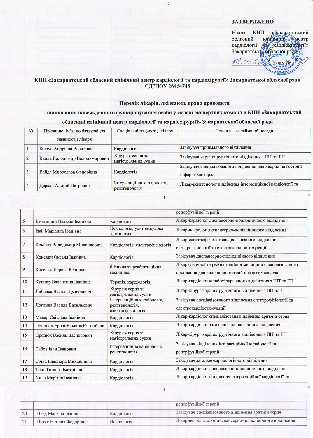 Перелік лікарів, які мають право проводити оцінювання повсякденного функціонування особи у складі експертних команд в КПН «Закарпатський обласний клінічний центр кардіології та кардіохірургії» Закарпатської обласної ради